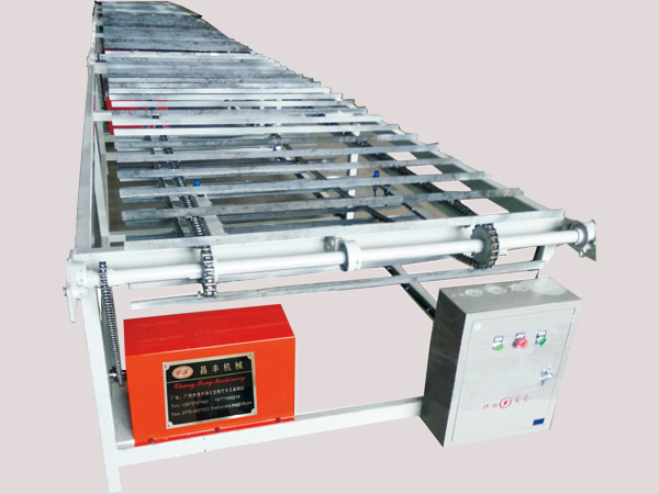 排板輸送線是將板芯經涂膠機涂膠后自動輸送到每個排板臺前。大大提高生產 效率,代替?zhèn)鹘y(tǒng)人工送板工藝。降低勞動成本。解決了輸送難,用人難,易爛板 等問題。
